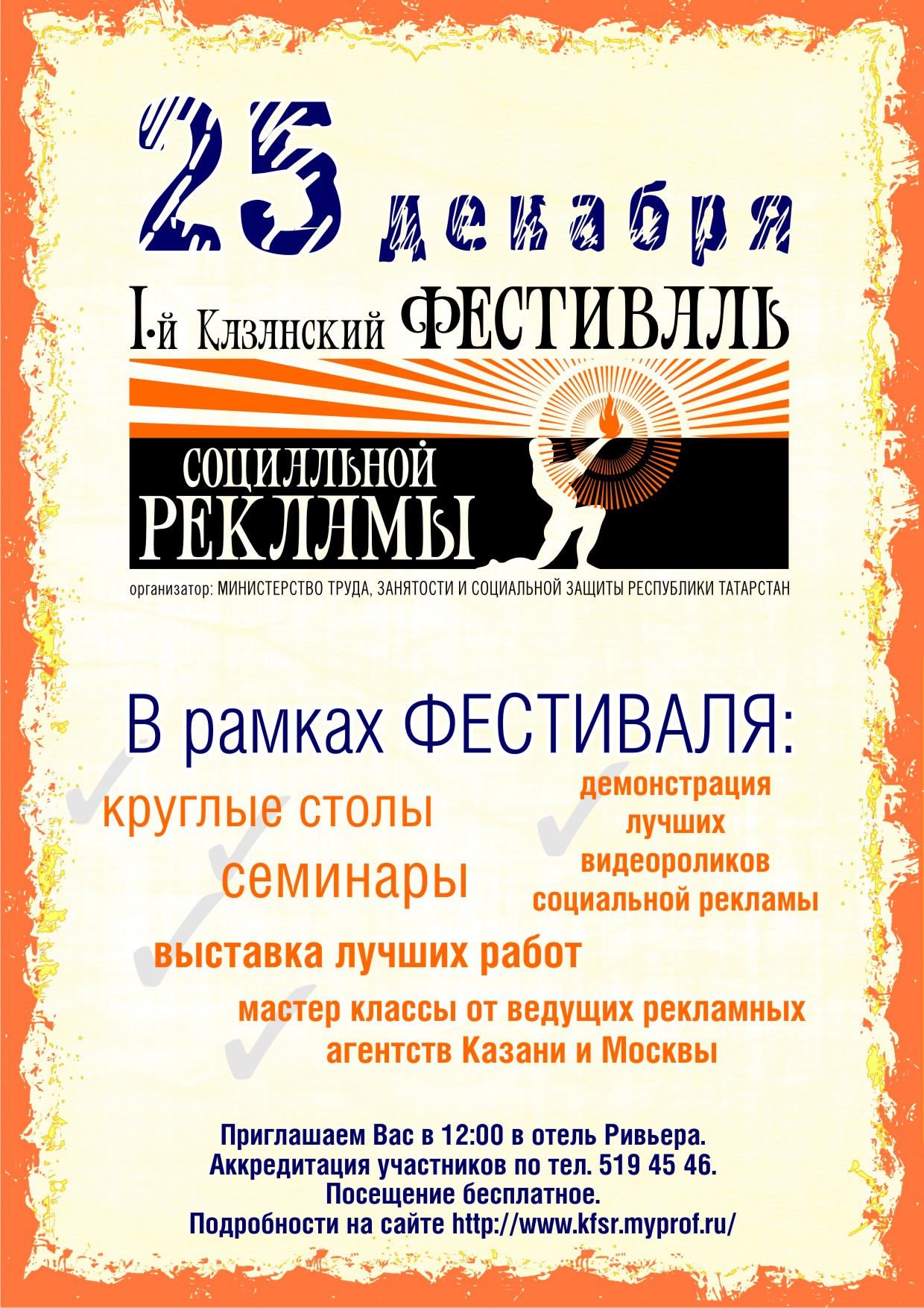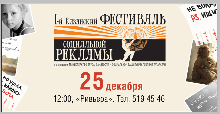 25 декабря в отеле «Ривьера» состоится финал Первого Казанского фестиваля социальной рекламы. Организатором выступает Министерство труда, занятости и социальной защиты РТ.